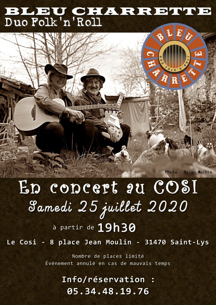 Vous aimez le folk, le blues, le rock, la country? Alors ne manquez pas, samedi 25 juillet à 19h30, le concert du groupe BLEU CHARRETTE. Réservation conseillée. Nombre limité de places. Annulation en cas de mauvais temps.